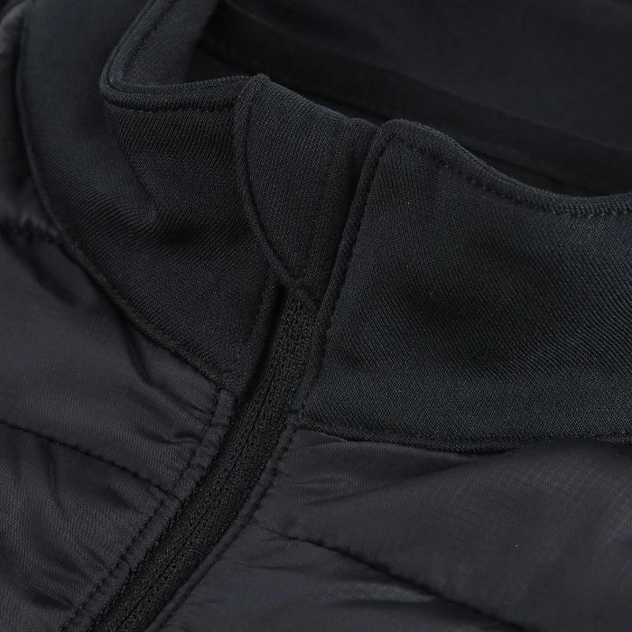 Top da allenamento con mezza zip frontale inserita in un collo alto. Parte inferiore frontale, posteriore e maniche in tinta unita. Pannello frontale superiore con carré e inserto imbottito sul petto con cuciture trapuntate.